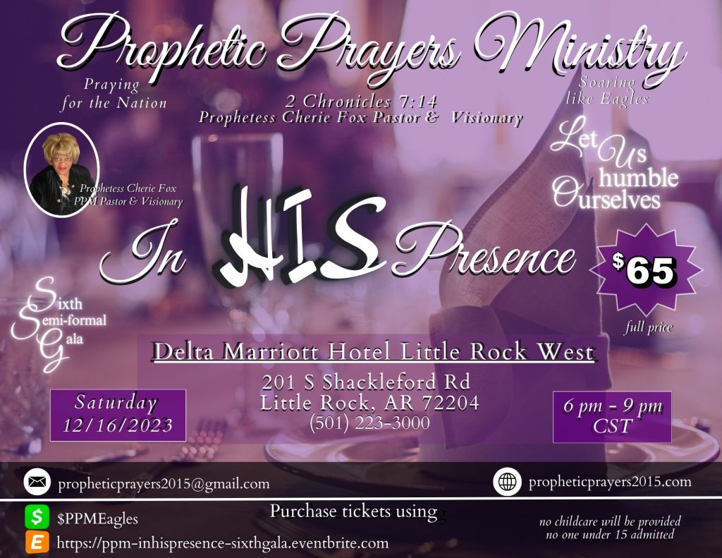 Ticket buying is accepted through these outlets Eventbrite: Prophetic Prayers Ministry 6th ‘In HIS Presence’ Gala! click (here). CASH App: $PPMEagles. All online payments must be received no later than Sunday, December 3, 2023.
