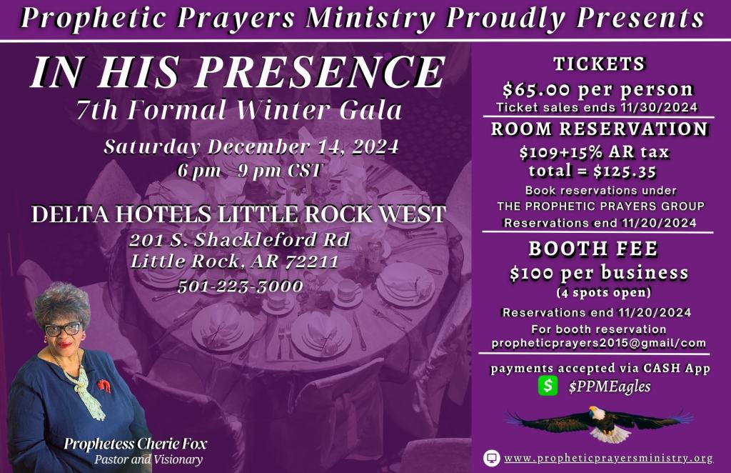 Be part of an unforgettable evening with us. Experience spiritual and physical nourishment at the Prophetic Prayers Ministry 6th ‘In HIS Presence’ Gala! This anointed event is on Saturday, December 16, 2023, at 6:00 p.m. (Central Standard Time). To be held at the Delta Marriott Hotel West at 201 South Shackleford Road, Little Rock, AR 72211.